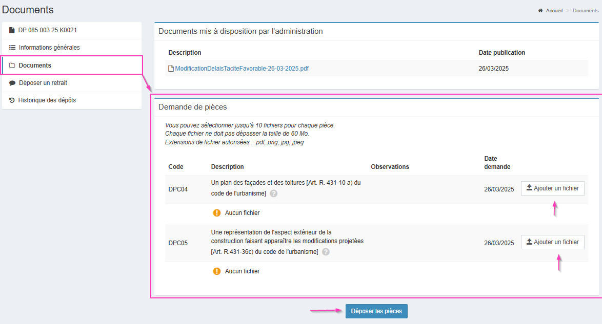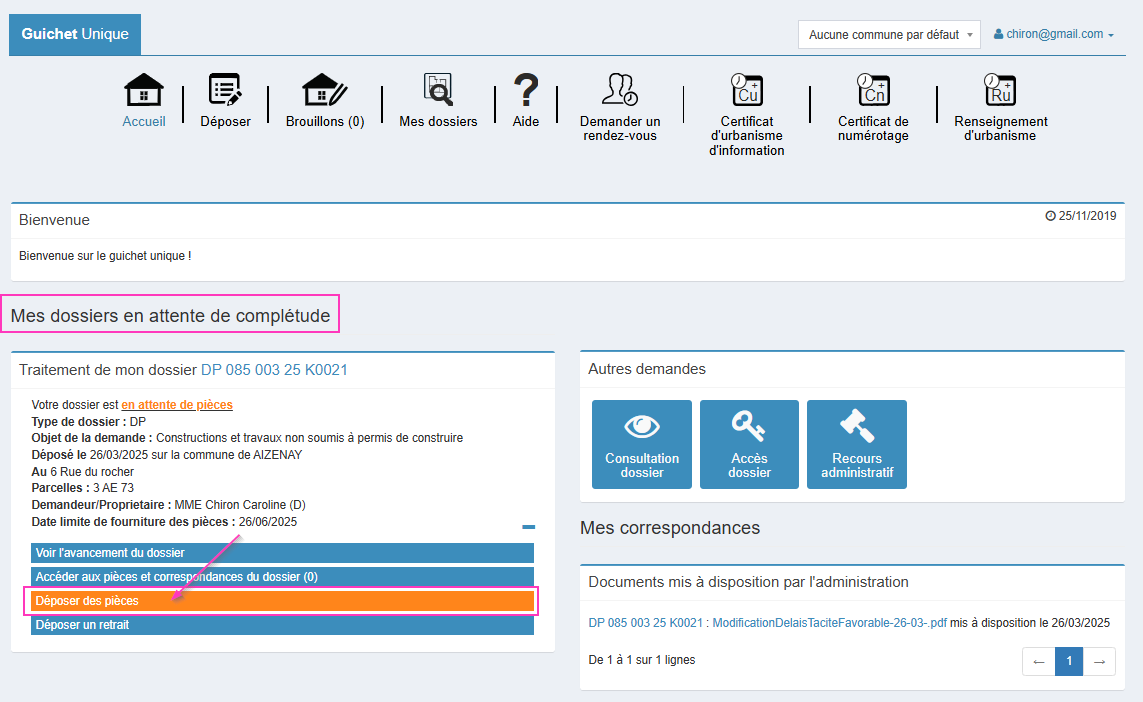 Dans le cas où votre dossier a fait l'objet d'une incomplétude. Utilisez la fonction [Déposer des pièces] depuis la vignette du dossier (ou le menu Documents) pour compléter votre demande. |