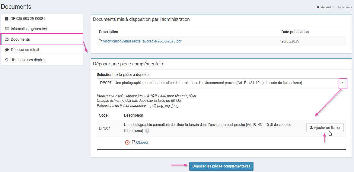 Dans le cas où vous souhaitez ajouter des pièces complémentaires à votre demande en cours d'instruction, utilisez la fonction [Déposer des pièces] depuis la vignette du dossier (ou le menu Documents). |